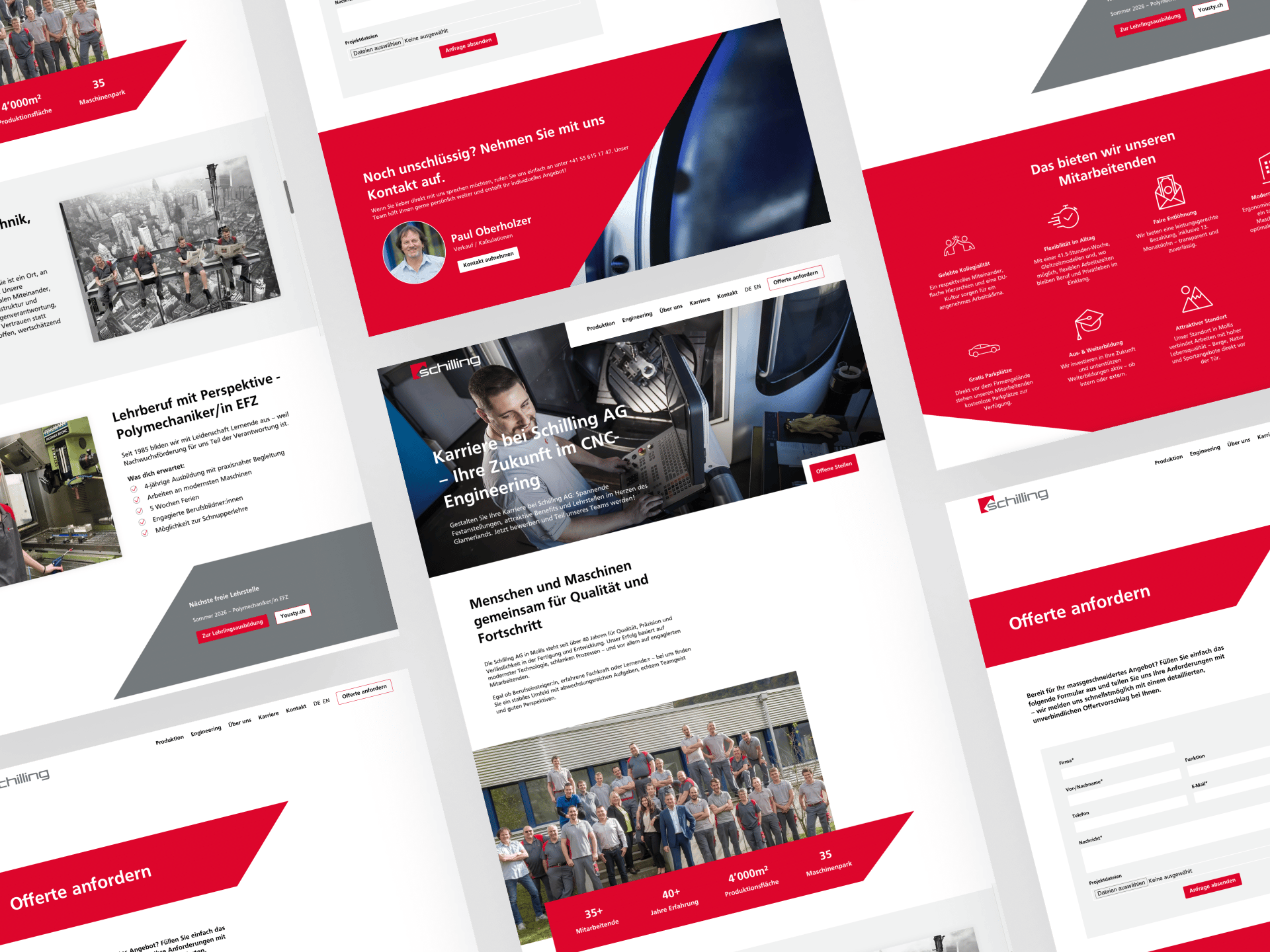 Die bisherige Website präsentierte ausschliesslich die Max Schilling AG. Mit der Gründung der Schilling Engineering Solutions GmbH entstand die Notwendigkeit, beide Unternehmen klar voneinander abzugrenzen und gleichzeitig digital miteinander zu verbinden. Darüber hinaus galt es, eine eigenständige Markenidentität für die neue Gesellschaft aufzubauen und diese im Web sichtbar zu machen. Neben dieser besonderen Herausforderung war ein technisches Upgrade erforderlich, um die Seite fit für SEO zu machen und ein responsives, zeitgemässes Design zu realisieren. Auch neue Landingpages für die einzelnen Services, ein ausgebauter Karrierebereich mit Offertenformularen sowie die Integration von Social-Media-Inhalten gehörten zu den Projektzielen. Zusätzlich musste die gesamte Website mehrsprachig in Deutsch und Englisch umgesetzt werden.