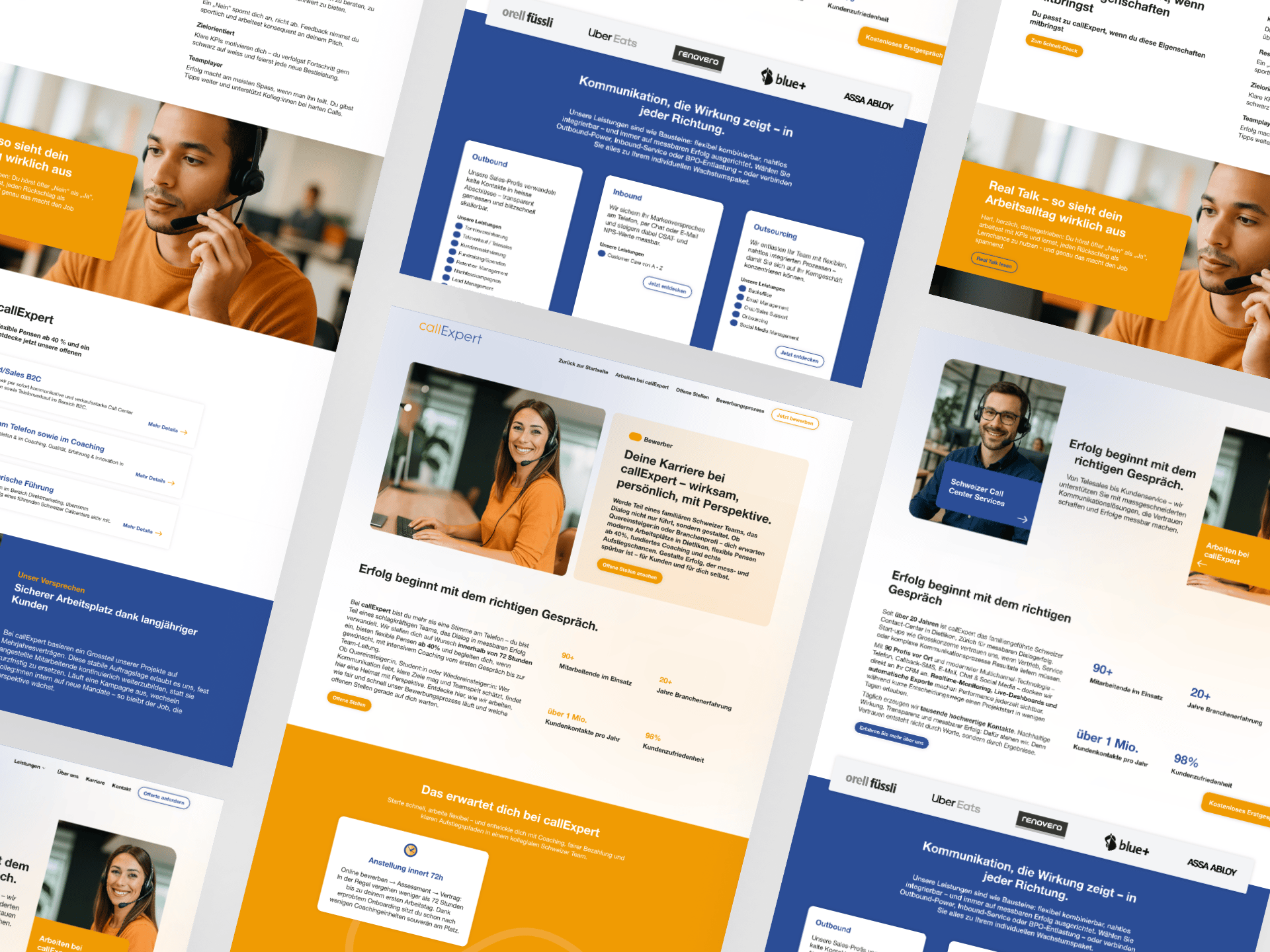 Der bisherige Internetauftritt von callExpert zeigte die breite Dienstleistungspalette nur oberflächlich und bot keine klare Nutzerführung zu Offerte oder Kontakt. Die Karriereinhalte waren verstreut, sprachen Quereinsteiger:innen kaum an und machten den schnellen Bewerbungsprozess nicht ersichtlich. Auch in den Suchmaschinen fehlte Sichtbarkeit für relevante Keywords wie „call center outsourcing schweiz“ oder „call center jobs schweiz“. Parallel wuchs der Wettbewerbsdruck: Unternehmen vergleichen Servicepartner stärker digital und Talente erwarten transparente Einblicke, flexible Arbeitsmodelle sowie einen einfachen Bewerbungsprozess. callExpert brauchte deshalb eine Website, die Vertrauen aufbaut und sowohl Entscheider:innen als auch Bewerber:innen zielgerichtet aktiviert.